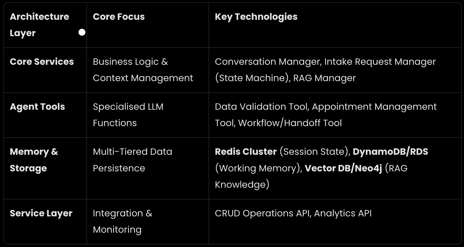- Dynamic State Management: The Intake Request Manager uses sophisticated state machine logic for AI‑driven adaptive questioning. It intelligently tracks booking progress and handles information provided by the user in any non‑linear order.